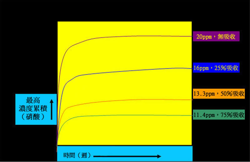 如果我们假设硝酸(NO3)被用掉25%,那么我们能够累积的最高的浓度为16 ppm。